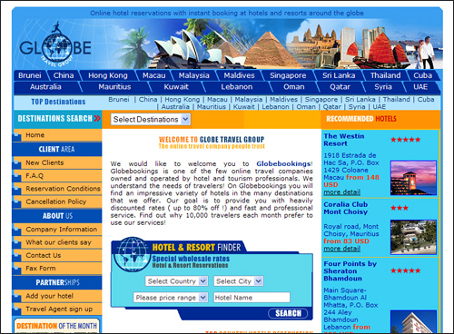 Create: December 2004 Project Info: Globe Travel Group is one of few online travel companies owned and operated by hotel and tourism professionals. Please click on thumbnail on the left to see detail